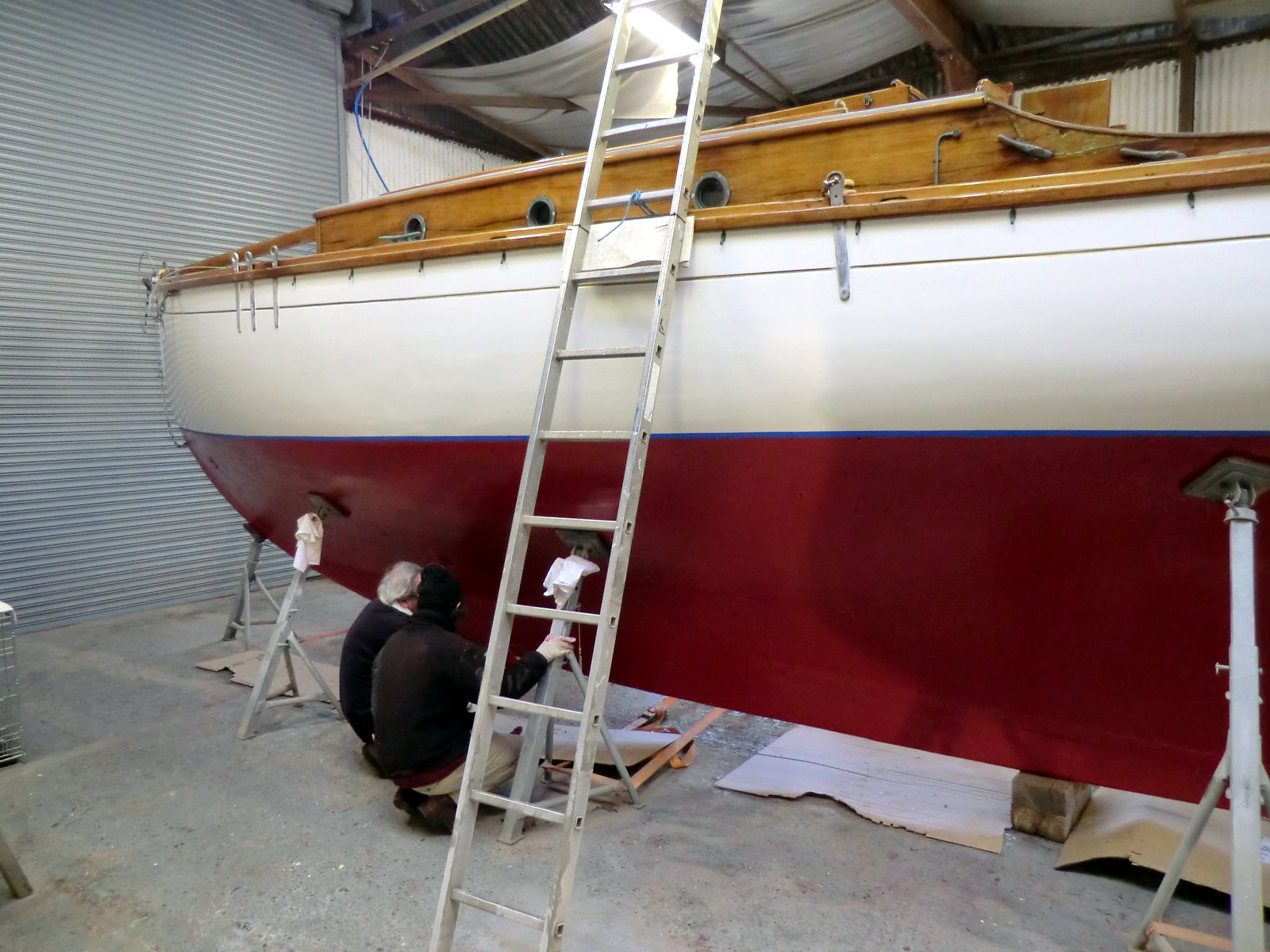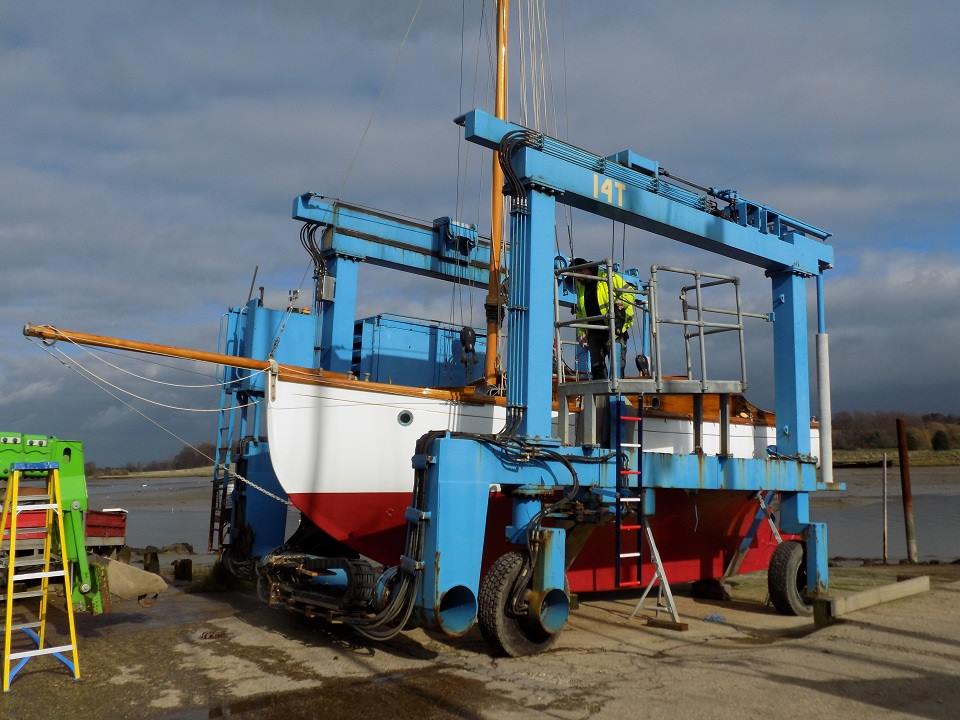 Following all the necessary repairs and maintenance tasks over the winter period, last Monday saw anti-fouling being applied, while on Tuesday she was taken out of the shed at Robertsons, Woodbridge, in readiness for her mast to be stepped.